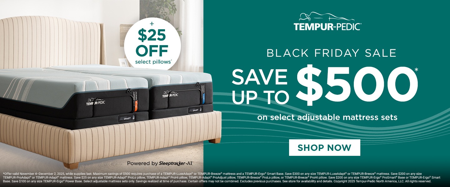 Black Friday is here. Save up to $500 on select adjustable mattress sets and get $25 off select pillows. Valid Nov 4 to Dec 2 2025 while supplies last. Discount has already been applied. Shop now and upgrade your sleep with Tempur Pedic comfort.