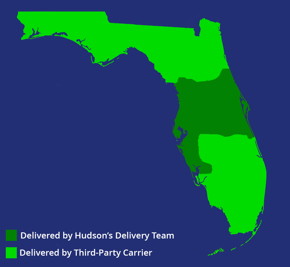 Local Florida deliveries are completed by Hudson’s delivery team using Hudson’s trucks. Deliveries outside the local area and nationwide deliveries are completed by third party carriers.